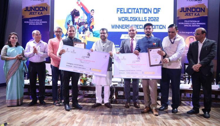 Pune (Voice news service):- Shri Dharmendra Pradhan, Hon’ble Minister for Education and Skill Development & Entrepreneurship felicitated 18 candidates from India, applauding their outstanding talents and skills displayed at the World Skills Competition 2022 Special Edition. India participated in 50 skills and secured 11th position with 2 Silver Medals, 3 Bronze Medals and 13 Medallion for Excellence. The winners and their expert trainers were honoured with certificates and cash prizes during a grand event.