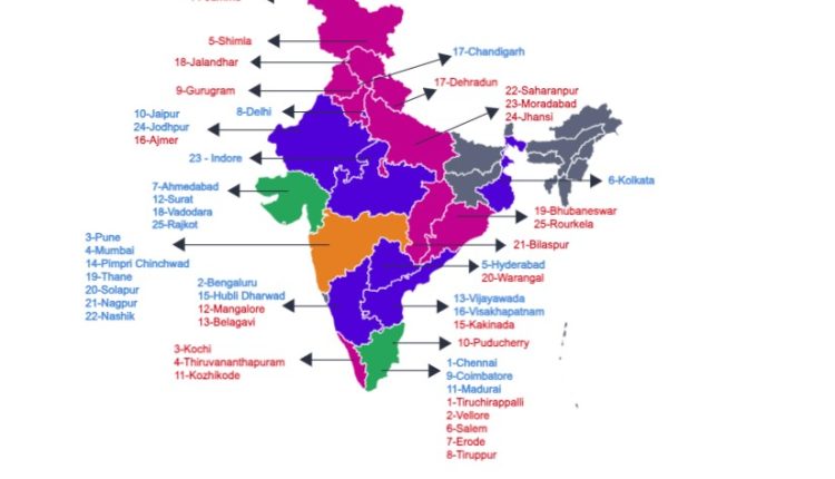 As many as 8 cities out of 10 in the less than a million-population category are from the Southern part of India – Tiruchirappalli, Vellore, Kochi, Thiruvananthapuram, Salem, Erode, Tiruppur and Puducherry. Only two cities – Shimla and Gurugram are from the Northern region. Tamil Nadu with Chennai and Coimbatore, and Maharashtra with Mumbai and Pune are the only states with two cities each in the million-plus category, that have made it to the Top 10 index.