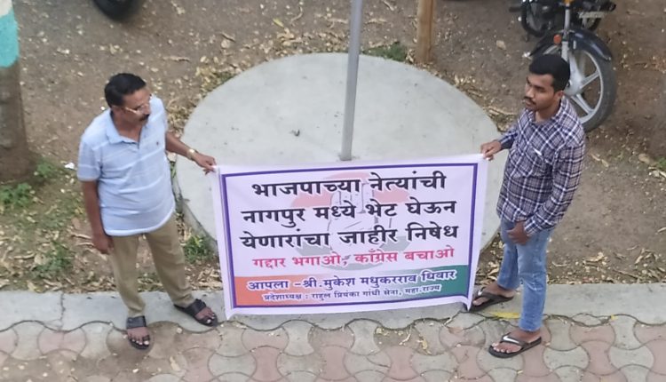 ‘नागपूर येथे भाजप नेत्यांची भेट घेऊन येणाऱ्यांचा जाहीर निषेध,’ अशा आशयाचे फलक झळकावले. तसेच, ‘गद्दार बघाओ, काँग्रेस बचाओ’चा नारा देखील देण्यात आला.