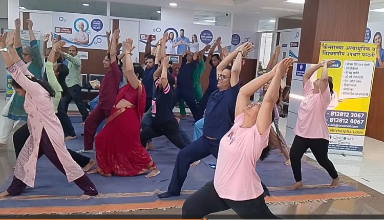 पुणे –तळेगाव : नेहमी हातात स्टेथेस्कोप घेऊन रुग्णांची तपासणी करणारे डॉक्टर, परिचारीका आज योग करताना दिसून आले. आंतरराष्ट्रीय योग दिनानिमित्त पुण्याच्या टीजीएच-ऑन्को लाइफ कॅन्सर सेंटरच्या वतीने रुग्णालयाचे डॉक्टर तसेच इतर कर्मचाऱ्यांकरिता विशेष योग सत्राचे आयोजन केले होते. योग प्रशिक्षक कल्याणी मुंगी यांच्या मार्गदर्शनाखाली डॉक्टरांनी योगविद्येचे धडे गिरवले.