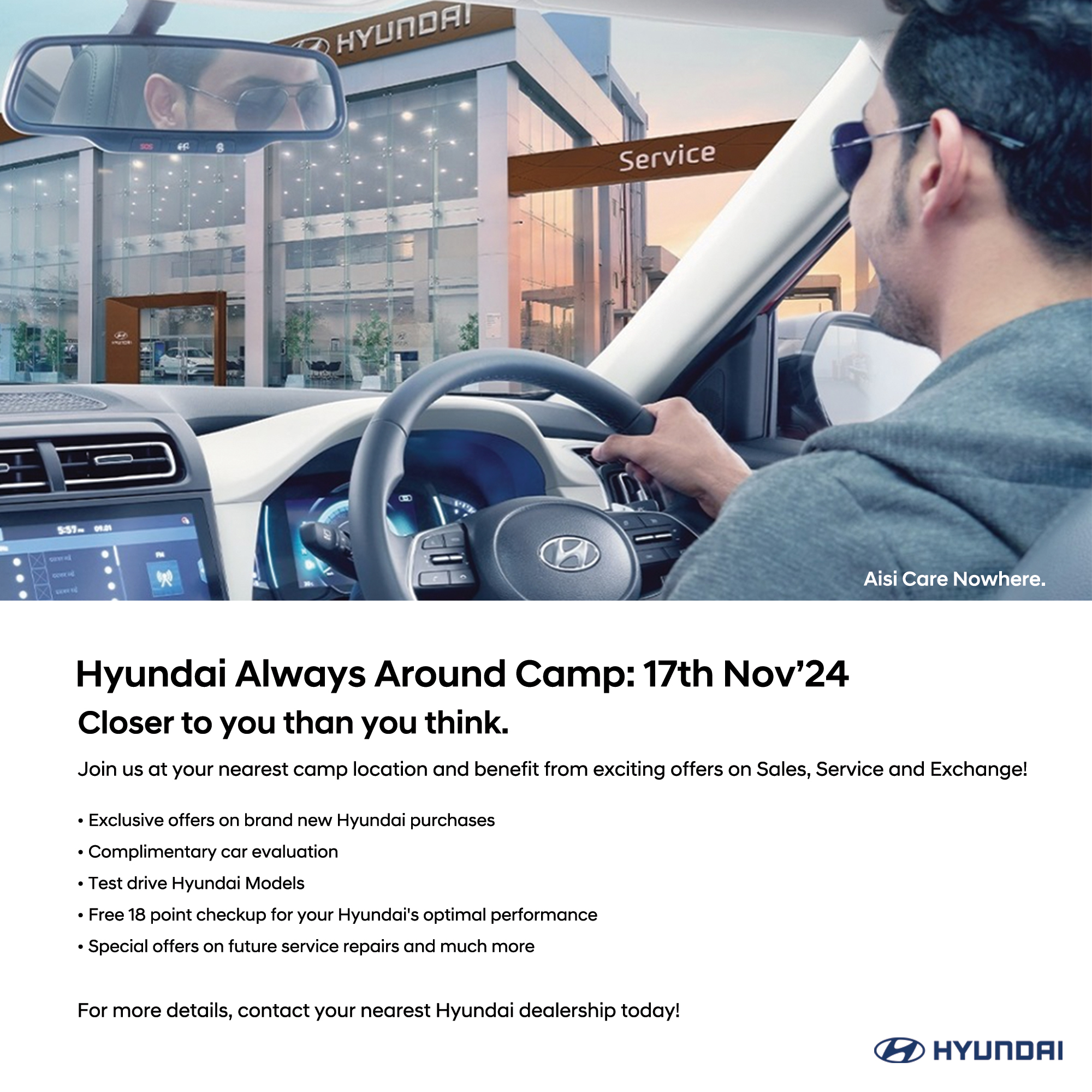 Customers and prospects can take test drives of multiple vehicles from the Hyundai portfolio. Various engagement activities have also been curated wherein the customers stand a chance to win 20% off on Accessories, Free Car Wash, 50% off on Wheel Alignment and Balancing, 20% off on PMS Labour billing, 30% off on interior cleaning and exterior enrichment, besides scratch cards for a chance to win upto INR 10,000 worth of accessories (valid for select models). Also, there are special offers for customers on downloading myHyundai App. One can contact their nearest Hyundai dealership to know more.