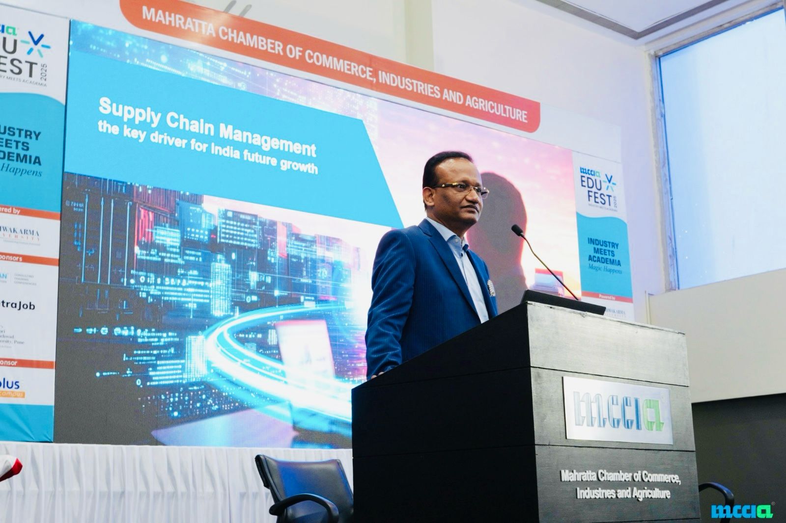 College in Mumbai. These alliances are focused on offering certification pathways, on-ground training modules, and structured internships that bridge the gap between academic theory and industrial application. “Pune is at the intersection of academia and industry. Its unique ecosystem makes it the ideal platform to nurture tomorrow’s supply chain leaders,” said Dr. Sathya Menon, Group CEO, Blue Ocean Corporation, who was a keynote speaker at MCCIA (Mahratta Chamber of Commerce Industries and Agriculture) Edu Fest 2025 held in Pune whose theme was Where Industry Meets Academia – Magic Happens.