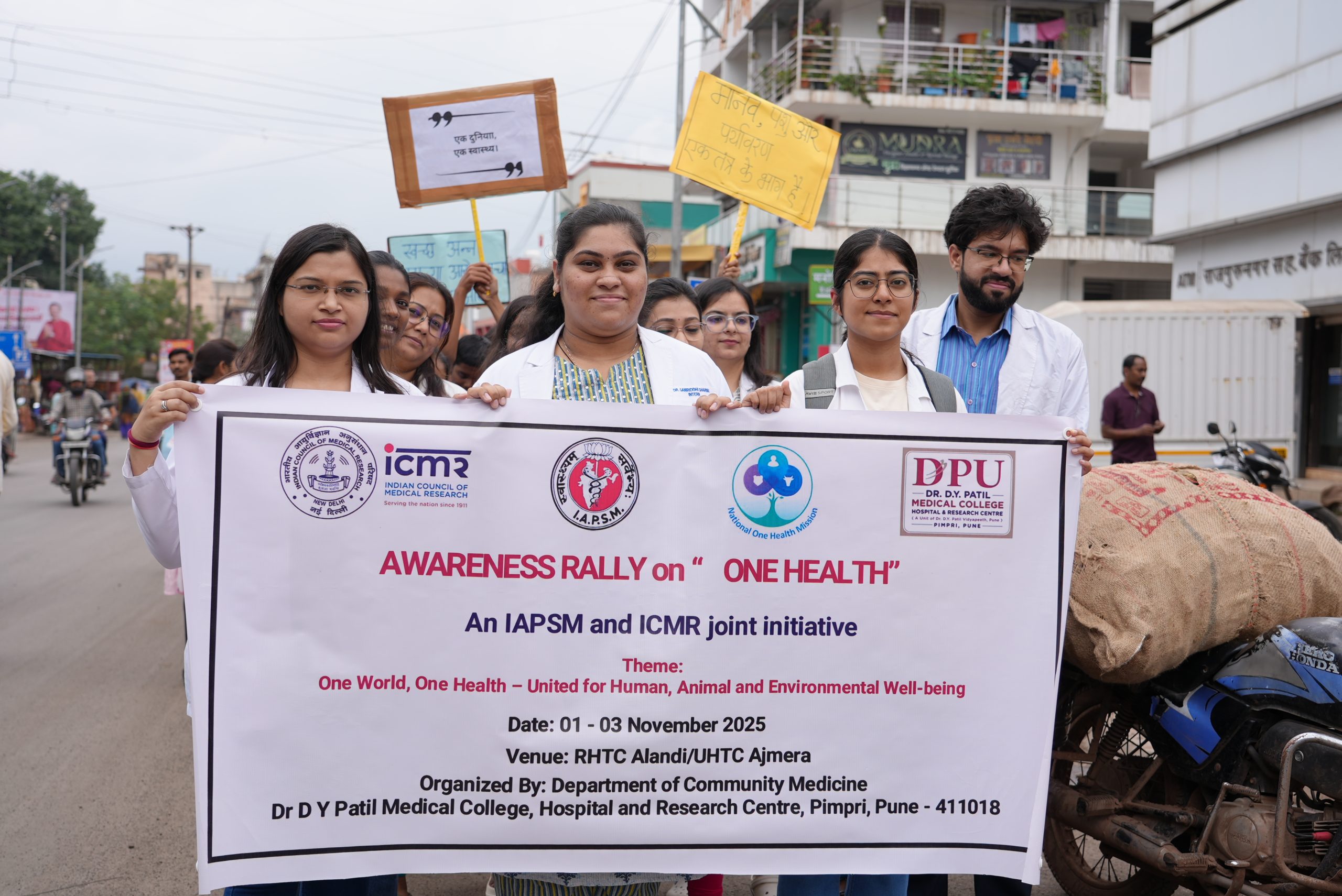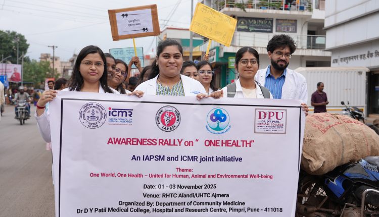 Pune – The Department of Community Medicine at Dr. D. Y. Patil Medical College, Hospital & Research Centre, Pimpri, Pune inaugurated the One Health Awareness Campaign 2025 with an enthusiastic Awareness Walkathon held at the Rural Health Training Centre (RHTC), Alandi and Urban Health Training Centre (UHTC) Ajmera. The event marked the beginning of a month-long series of educational and outreach initiatives organized under the National One Health Mission (NOHM) Conclave 2025, a joint initiative of the Indian Association of Preventive and Social Medicine (IAPSM) and the Indian Council of Medical Research (ICMR).