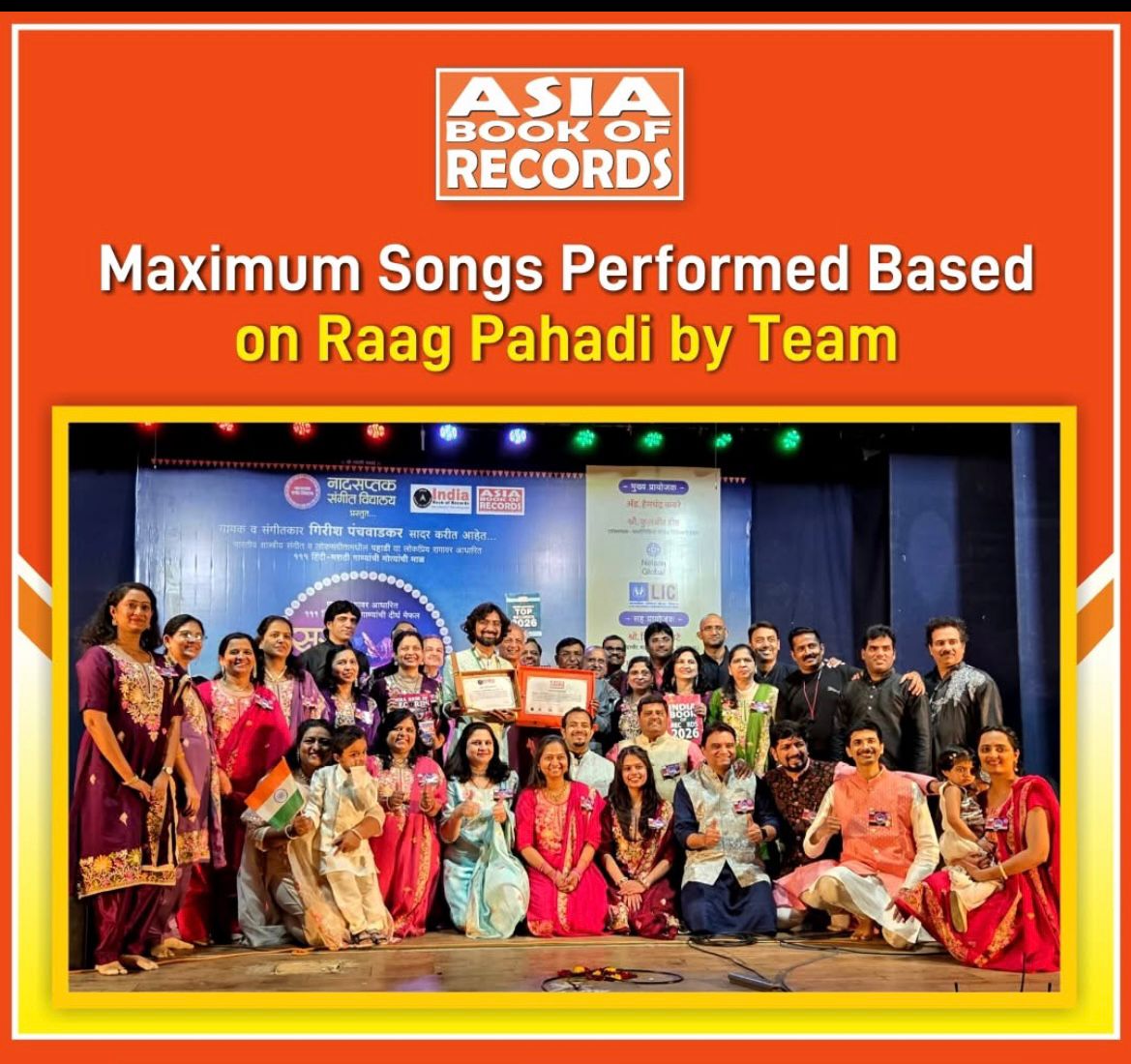 Pune : The special musical program “Sur Pahadi”, presented by the students of Nadasaptak Sangeet Vidyalaya, Pune, has been officially recorded in both the India Book of Records and the Asia Book of Records.