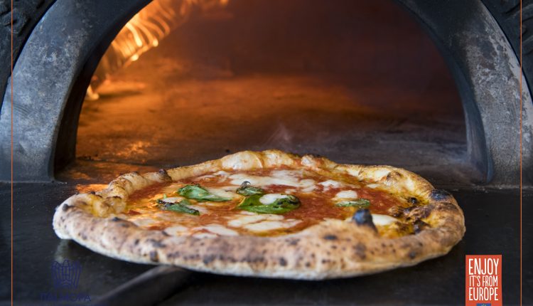 Place the flour on a work surface and make a well in the middle; dissolve the yeast into the water and add the sugar and slowly pour the water into the well, kneading as you pour. Add the oil and salt and continue to knead for about 20 minutes until the dough is smooth and elastic. Place in a bowl, cover and leave to rise for at least 6/8 hours in a place protected from cold draughts. Then you can stretch the dough to make the pizza with the topping of your choice. “Pure Flour from Europe” suggests a classic Margherita with tomato, fiordilatte cheese and basil.