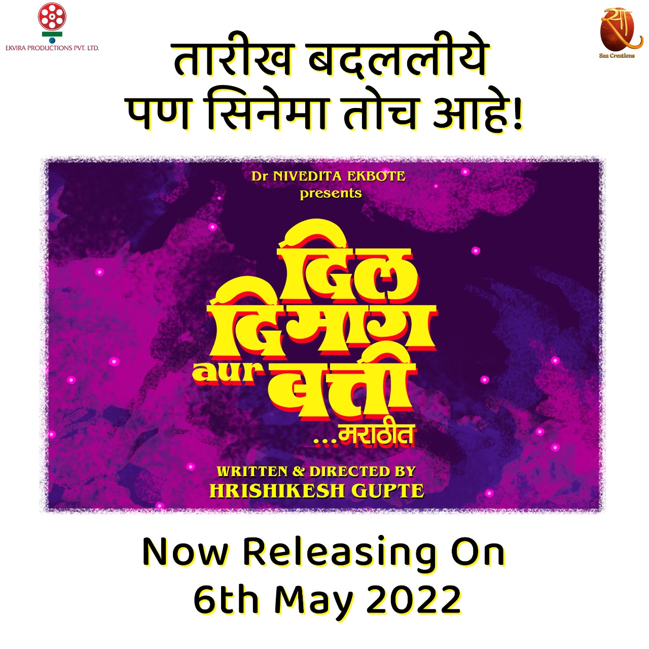 सा क्रिएशन्स ची पहिलीच निर्मिती असलेल्या “दिल दिमाग और बत्ती” या मराठी चित्रपटाचे लेखक आणि दिग्दर्शक हृषीकेश गुप्ते आहेत. सोनाली कुलकर्णी, दिलीप प्रभावळकर, वंदना गुप्ते, पुष्कर श्रोत्री, किशोर कदम, आनंद इंगळे, वैभव मांगले, सागर संत, मयुरेश पेम, संस्कृती बालगुडे, सखी गोखले, पुष्कराज चिरपुटकर, रेवती लिमये, मेघना एरंडे, संजय कुलकर्णी, विनीत भोंडे अशी तगडी स्टारकास्ट असून छायांकन सलील सहस्त्रबुद्धे यांचे आहे. “दिल दिमाग और बत्ती” ६ मे रोजी संपूर्ण महाराष्ट्रात प्रदर्शित होणार आहे.