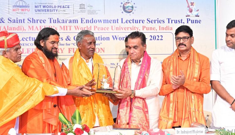 Pune : “Today’s Education System Should Concentrate on Preparing the Mind of the student instead of only Focusing on the Brain. Due to focus only on Brain, the mind has become weak. The Gurukul system, which focused on human values is way better than today’s education system which is not equipped to face various internal crisis”, said Padma Shri Sadguru Brahmeshanandacharya Swamiji Peethadhishwar of Shree Datta Padmanabh Peeth, Shree Kshetra Tapobhoomi, Kundaim, Ponda – Goa at the Valedictory Ceremony of the 27th Saint Shree Dnyaneshwara and Saint Shree Tukaram Endowment Lecture Series 2022 organized by World Peace Center and MIT World Peace University of MAEER’s MIT Group of Institutions, Pune at MIT WPU Kothrud Campus, Pune. The Endowment Lecture Series is an annual feature which is a part of the UNESCO Chair Programme for Human Rights, Democracy, Peace & Tolerance.
